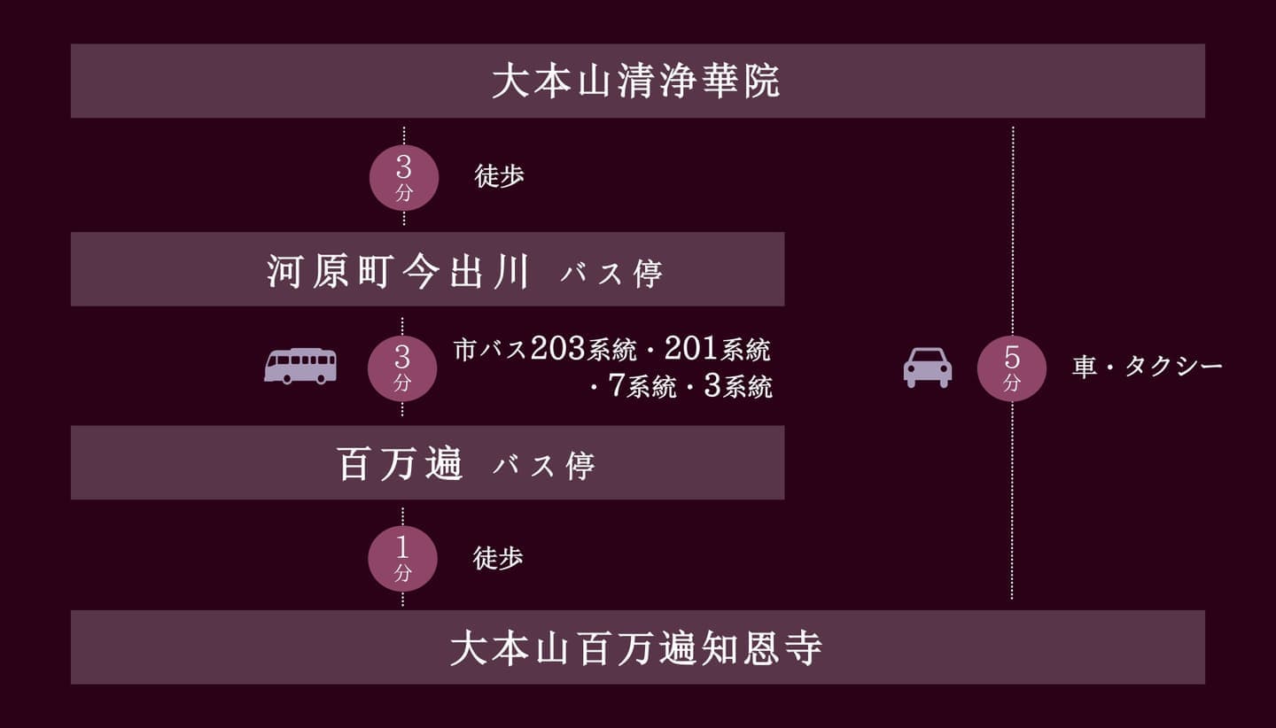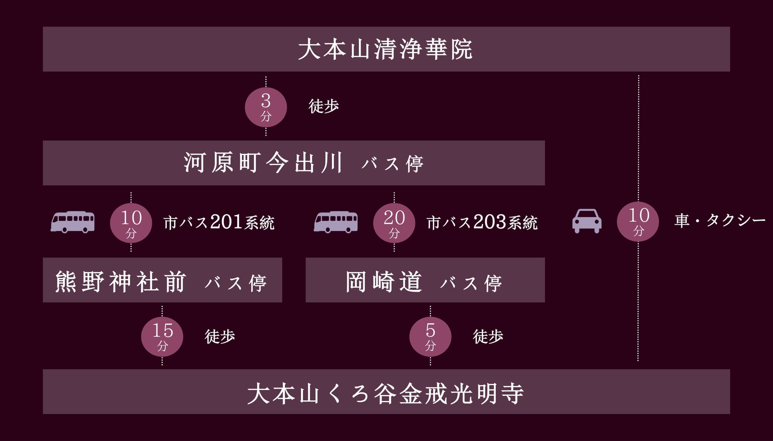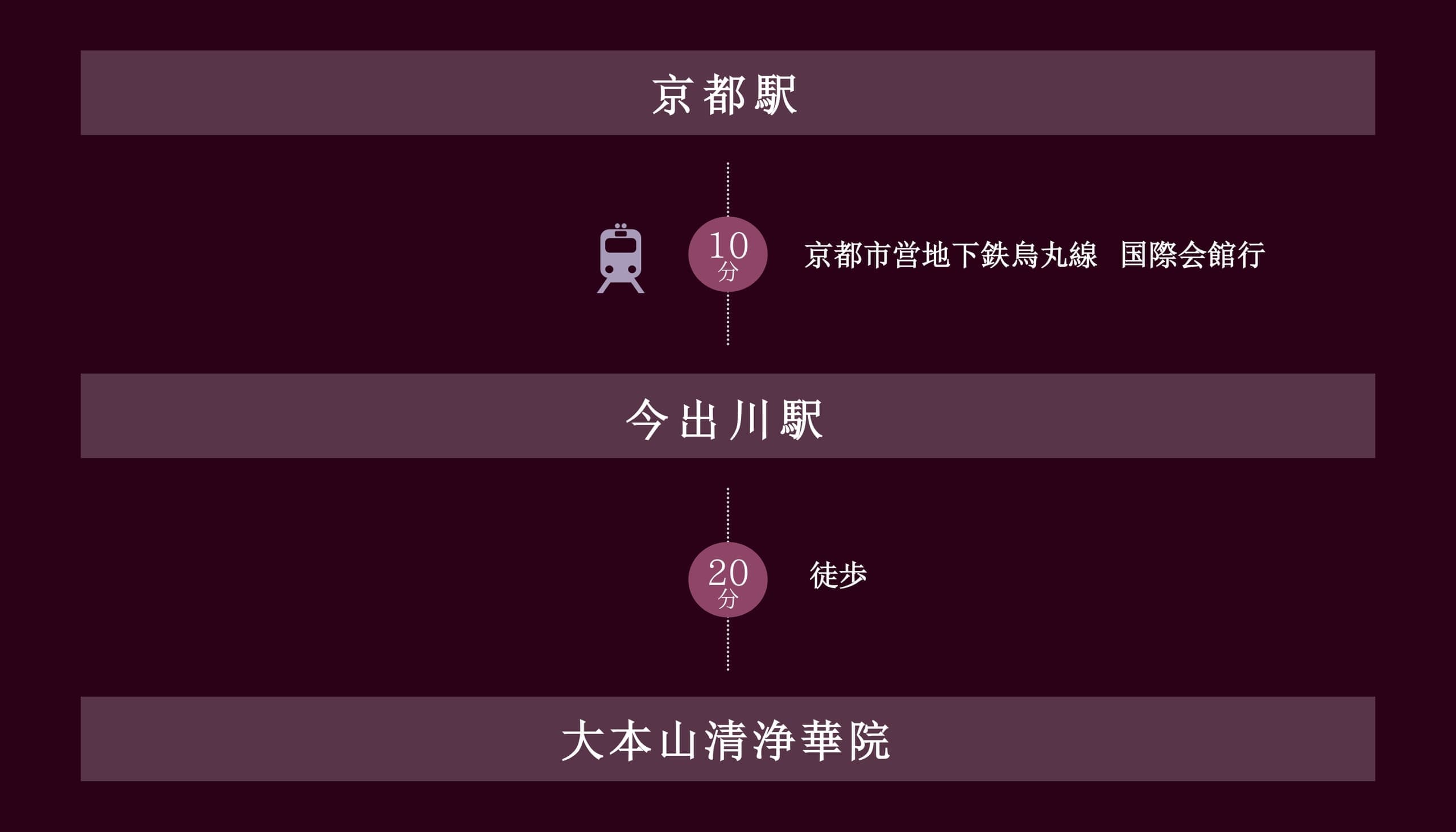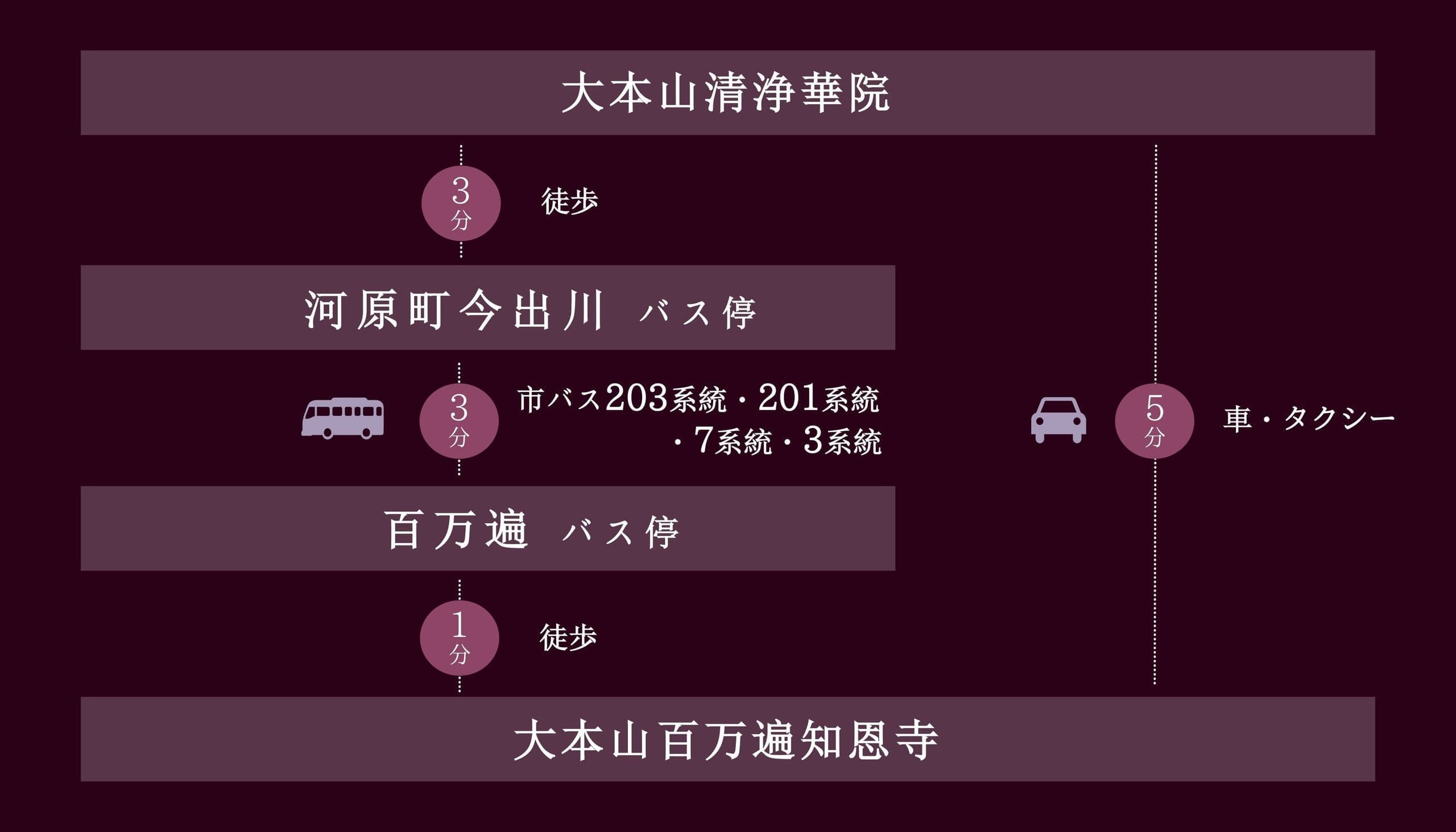 〒602-0852 京都市上京区北之辺町395 京都駅からお越しの方 バス 電車 タクシー ※時期や時間帯により道路が混雑する場合がございます。 阪急電車でお越しの方 バス 電車 タクシー ※時期や時間帯により道路が混雑する場合がございます。 京阪電車でお越しの方 バス 徒歩 タクシー ※時期や時間帯により道路が混雑する場合がございます。 お車でお越しの方 参拝の方は境内に駐車が可能です。行事等で駐車ができない場合は、お近くのコインパーキングをご利用ください。 ※東門は大変狭くなっておりますので、総門からの出入りをお勧めします。※寺町通りは清浄華院より北側が一方通行となっております。今出川通りからの進入はできませんのでご注意ください。 名神高速道路京都東I.C.より 約20~25分京都南I.C.より 約25~30分 ※時期や時間帯により道路が混雑する場合がございます 法然上人二十五霊場参拝の方 二十二番 百万遍知恩寺 二十四番 くろ谷金戒光明寺 二十番 誓願寺