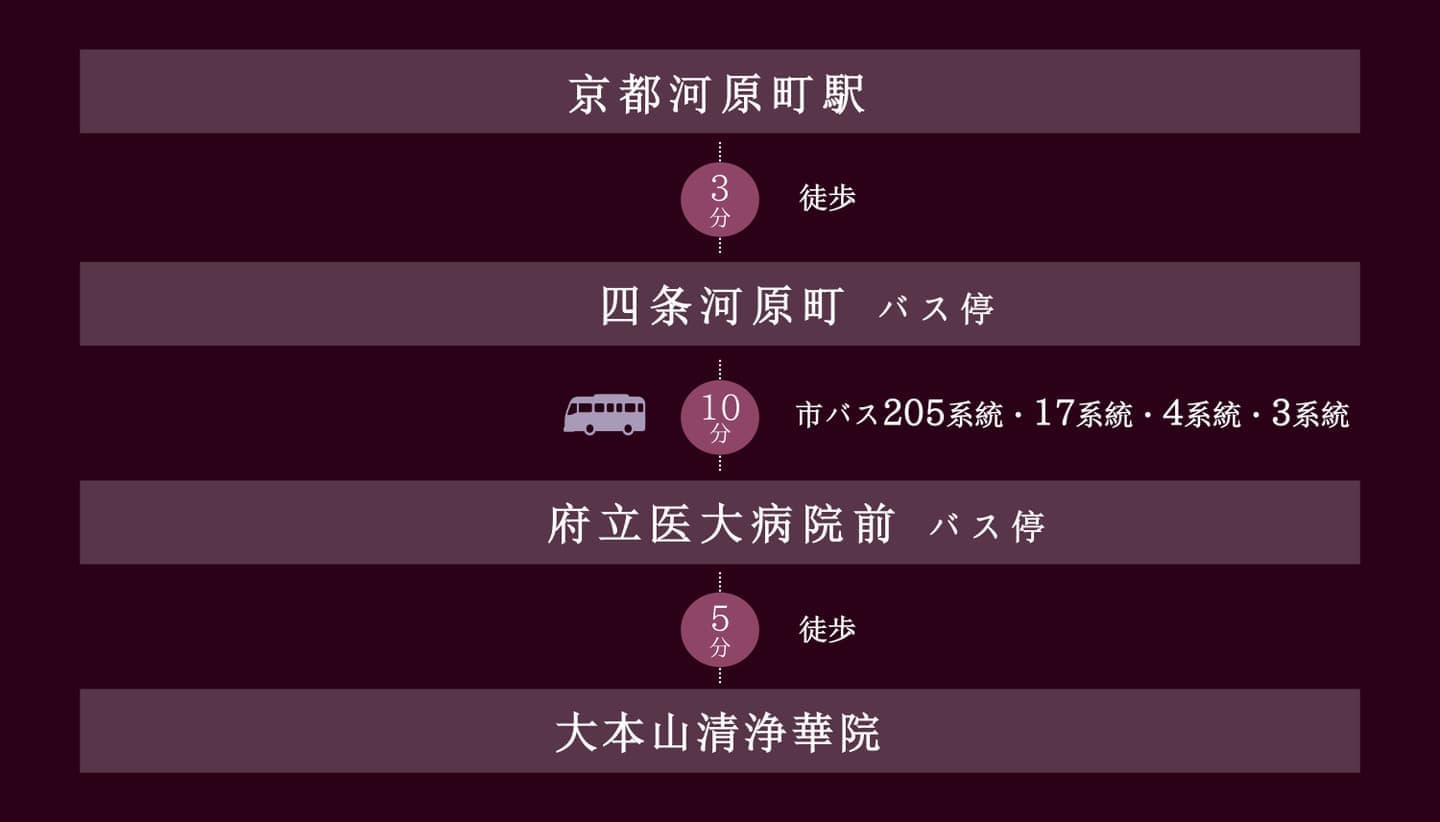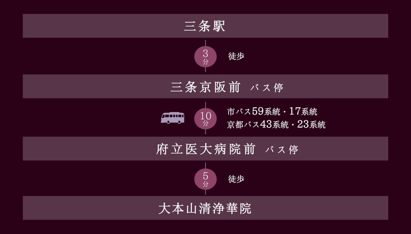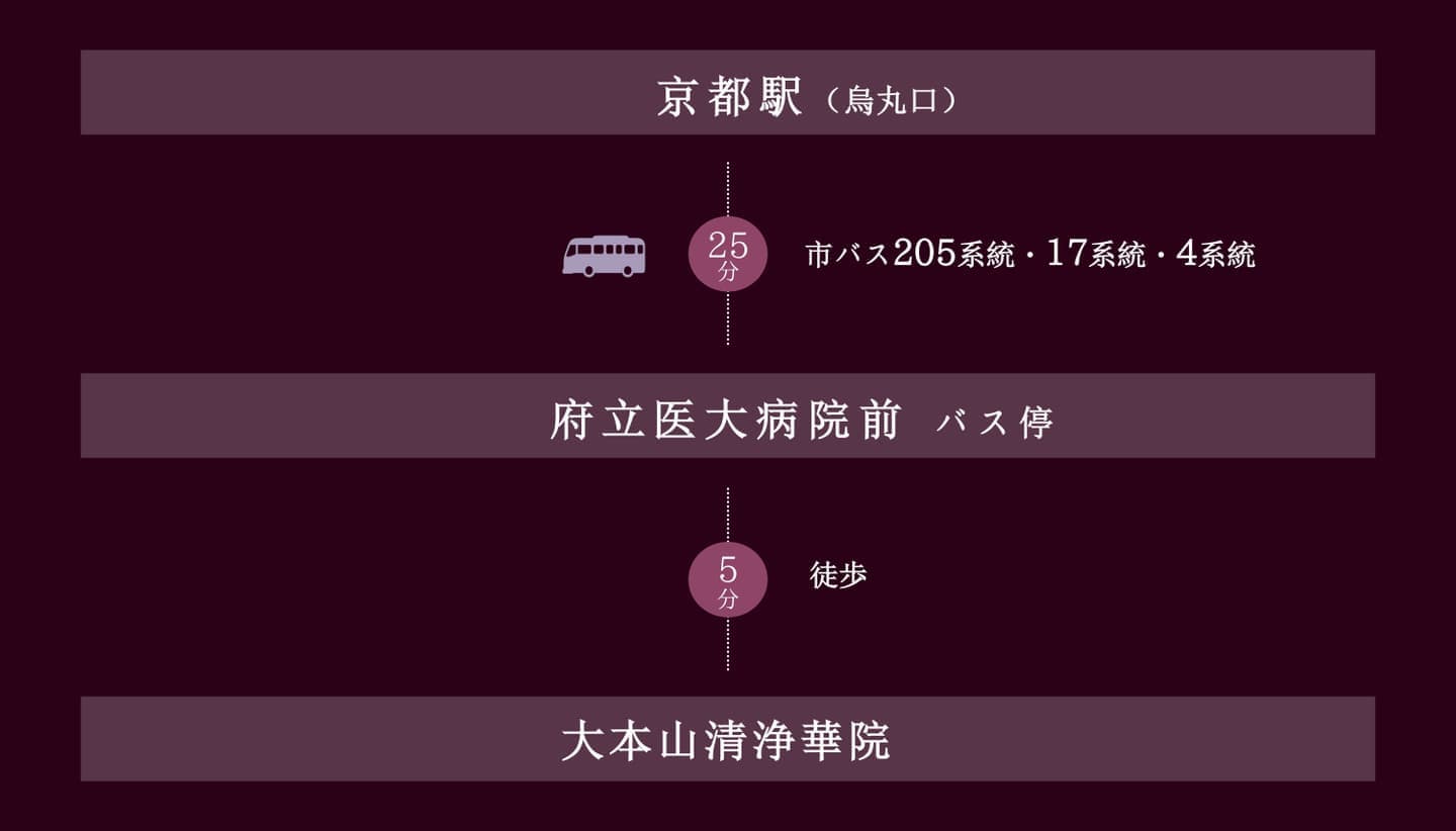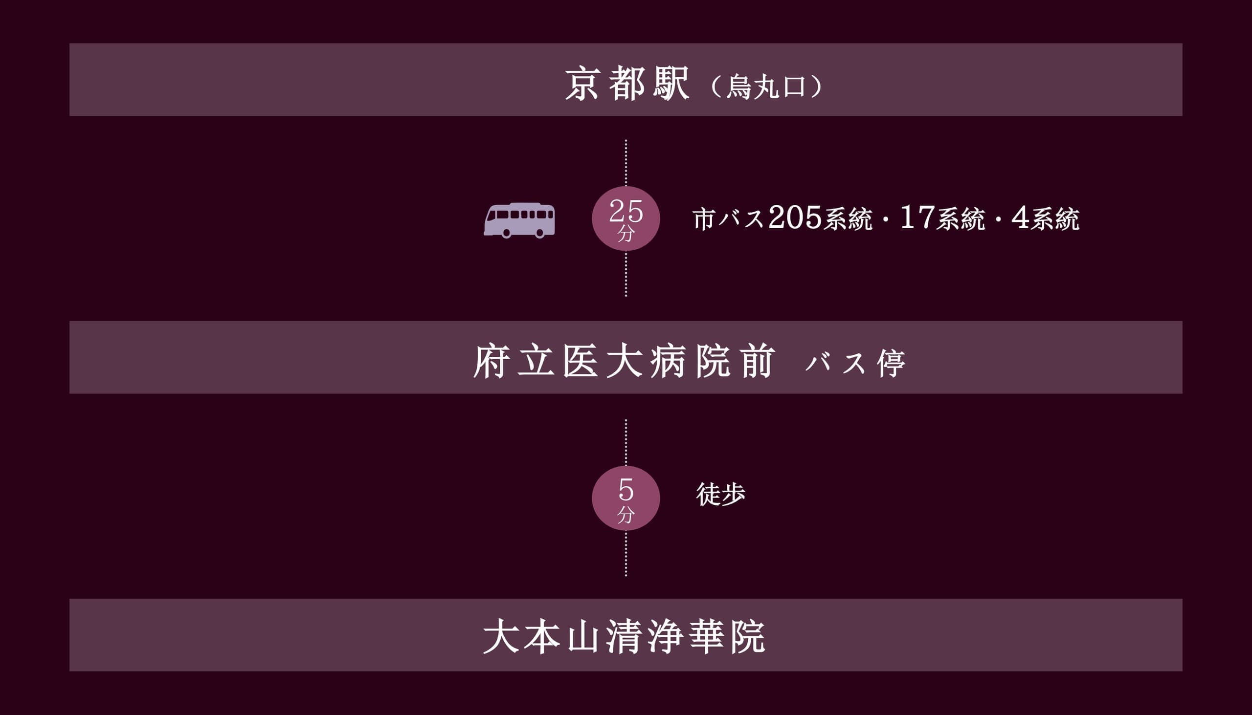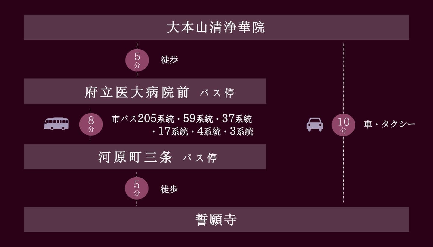 〒602-0852 京都市上京区北之辺町395 京都駅からお越しの方 バス 電車 タクシー ※時期や時間帯により道路が混雑する場合がございます。 阪急電車でお越しの方 バス 電車 タクシー ※時期や時間帯により道路が混雑する場合がございます。 京阪電車でお越しの方 バス 徒歩 タクシー ※時期や時間帯により道路が混雑する場合がございます。 お車でお越しの方 参拝の方は境内に駐車が可能です。行事等で駐車ができない場合は、お近くのコインパーキングをご利用ください。 ※東門は大変狭くなっておりますので、総門からの出入りをお勧めします。※寺町通りは清浄華院より北側が一方通行となっております。今出川通りからの進入はできませんのでご注意ください。 名神高速道路京都東I.C.より 約20~25分京都南I.C.より 約25~30分 ※時期や時間帯により道路が混雑する場合がございます 法然上人二十五霊場参拝の方 二十二番 百万遍知恩寺 二十四番 くろ谷金戒光明寺 二十番 誓願寺