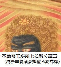 不動明王が頭に頂く蓮の花 臨終に不動明王が極楽往生を目指す念仏者を守護するという信仰は、極楽の主、阿弥陀如来と不動が一体であるという信仰も生み出します。